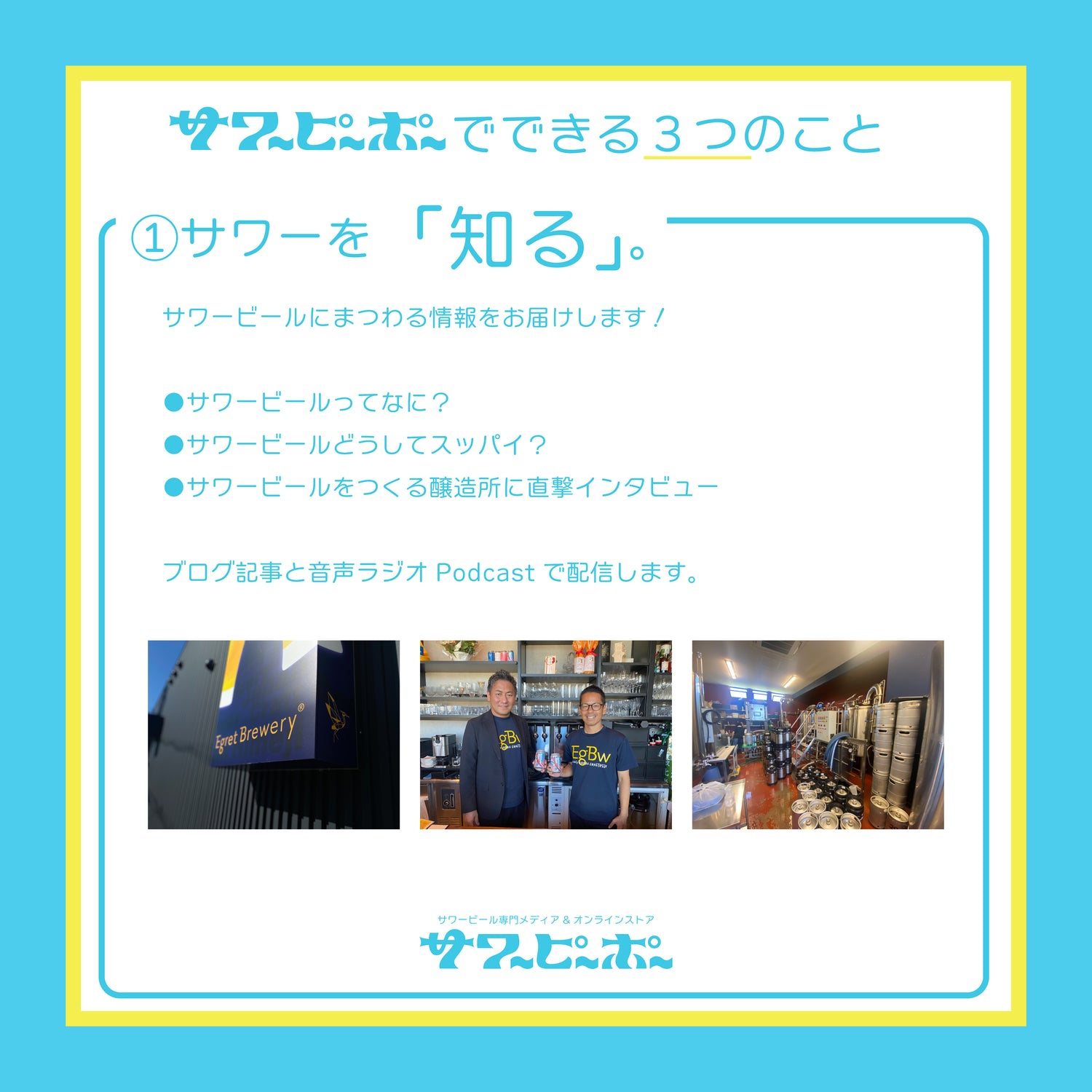 音声番組「サワピポッドキャスト」を配信開始しました! サワービールをつくる醸造所へお邪魔し、ビール造りのこだわりや裏話を深堀りし、クラフトビールの魅力を深堀りしていきます。 記念すべき初回は兵庫県姫路市の「Eagret Brewery」さん。 定番サワービールのRainbow shotについてお聴きしてきました! ぜひお聴きください。 【リンク】 https://open.spotify.com/show/4FTukTBOP9qTuyTncVsTpH?si=d011284fbf504d58